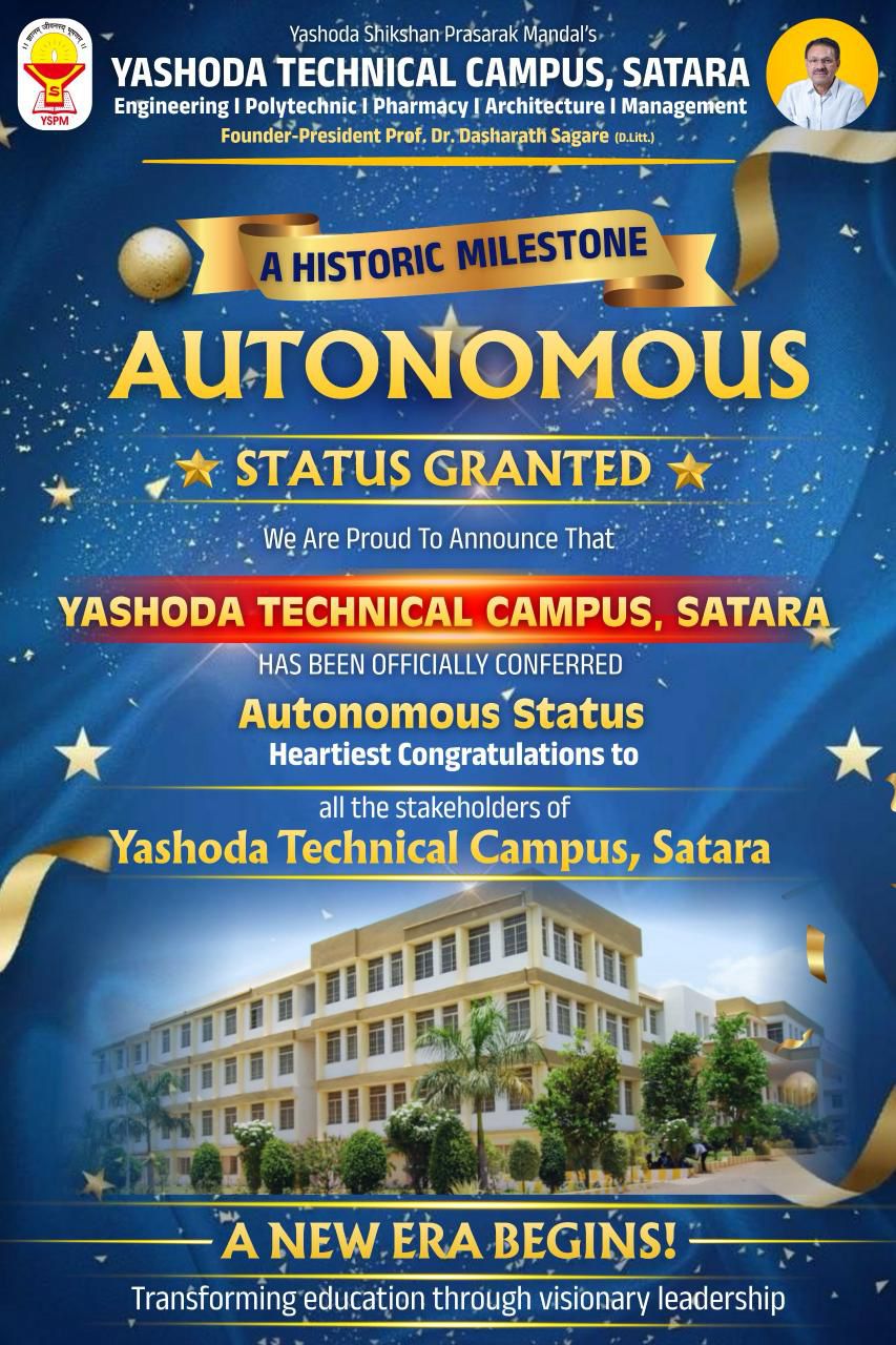 Yashoda Technical Campus, Satara has been conferred with Autonomous Status by the University Grants Commission, India.