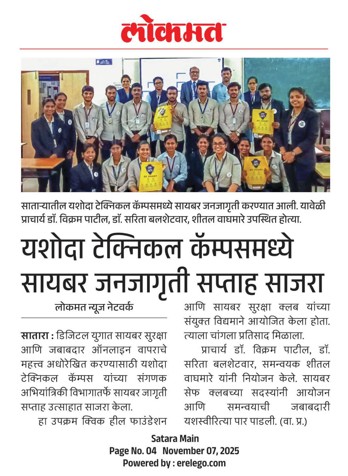 यशोदा टेक्निकल कॅम्पस च्या विद्यार्थ्यांची क्विक हिल सायबर शिक्षा व सुरक्षा अभियानात निवड