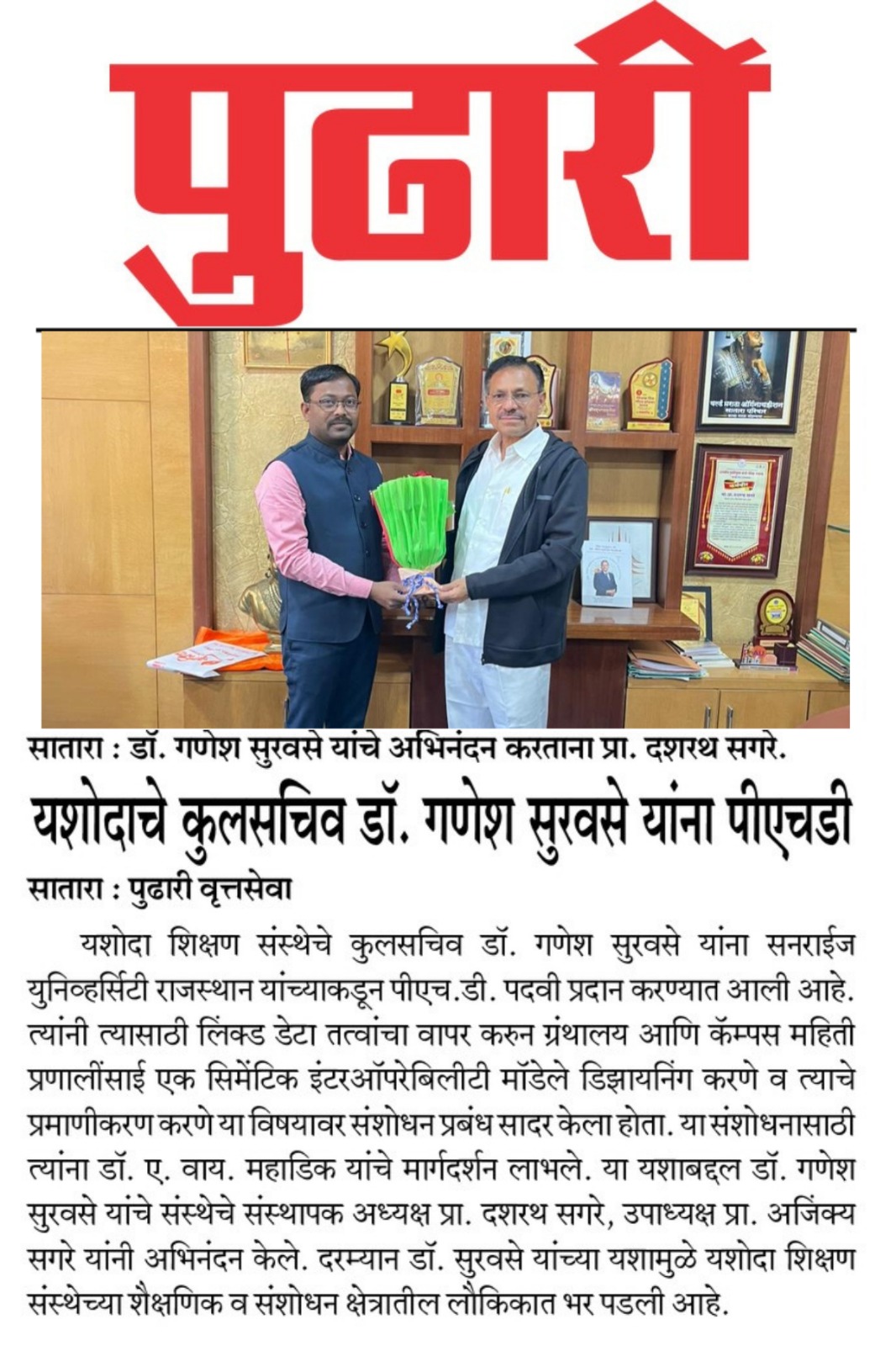 यशोदा इन्स्टिट्यूट चे उपाध्यक्ष प्रा.अजिंक्य सगरे यांचा आदर्श युवा पुरस्काराने गौरव