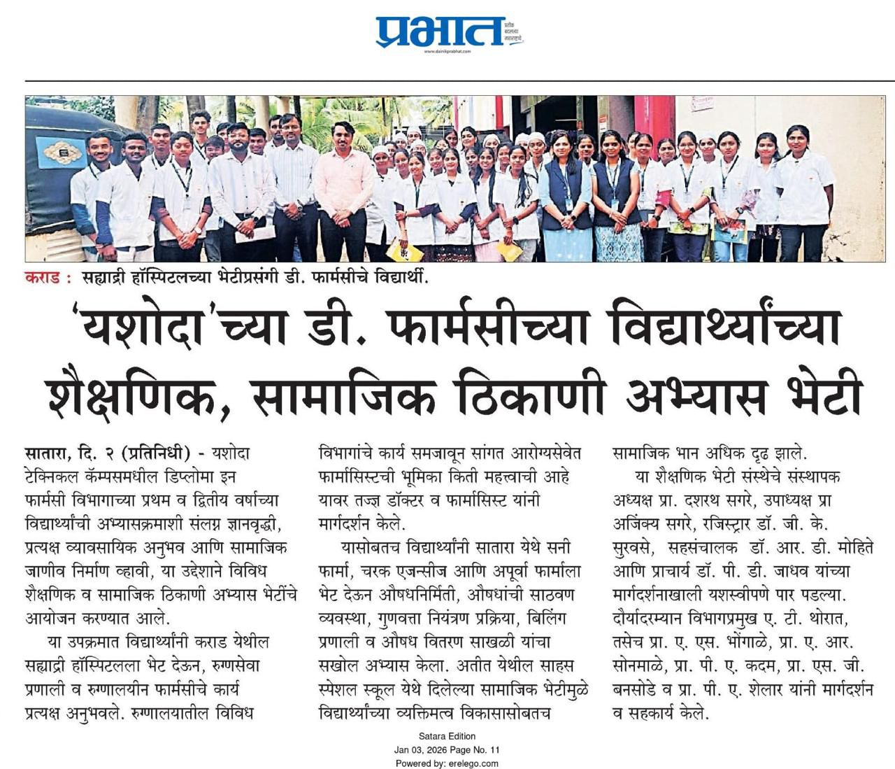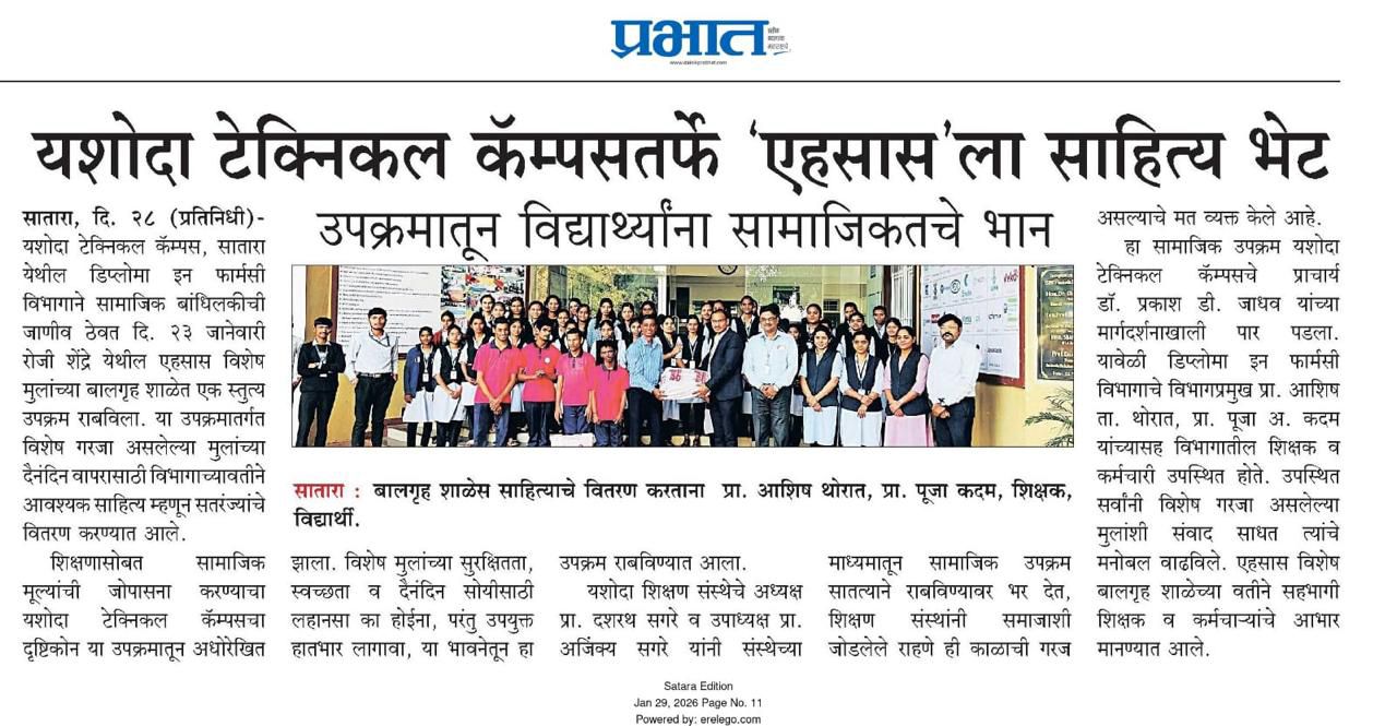 यशोदा’ चे डी. फार्मसी विभागास एम.एस.बी.टी.ई कडुन ‘एक्सलेंट’ ग्रेड प्रदान