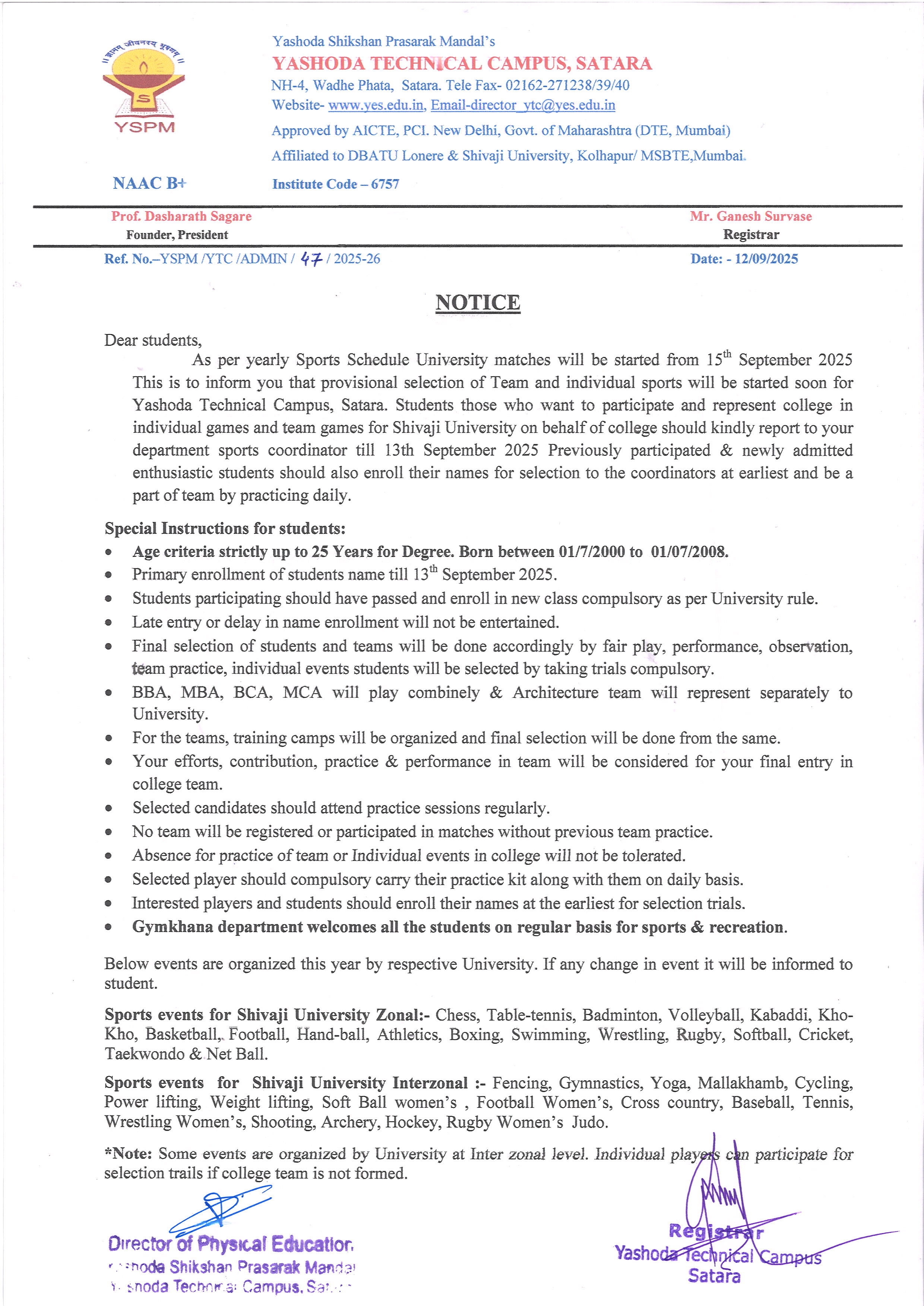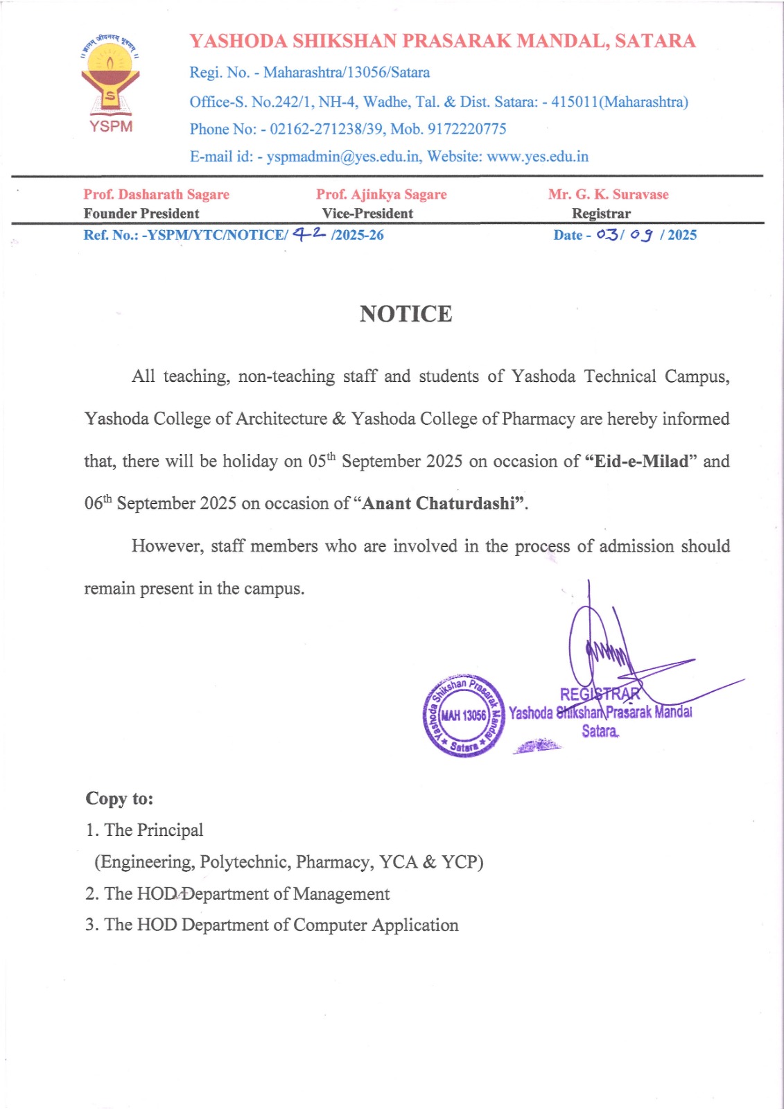 नोटीस सर्व शिक्षक Engineering MBA - MCA रविवार दिनाक ०३.०८.२०२५ रोजी महाविद्यालयात दैनंदिन कामकाज सुरु असल्याबाबत |