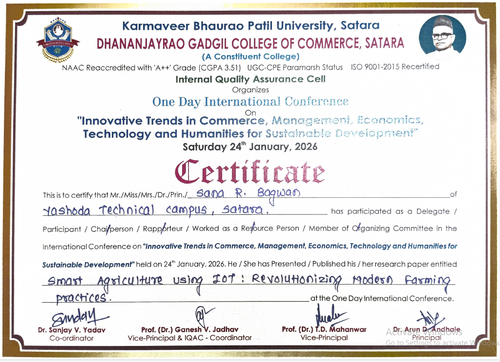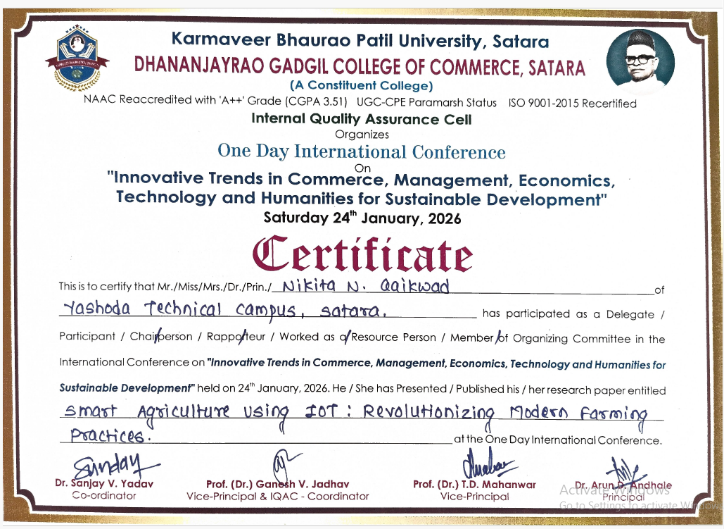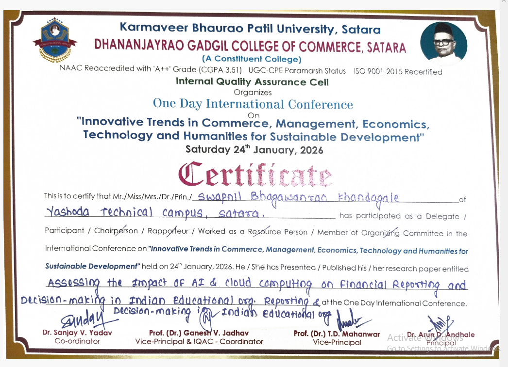 Mr. Swapnil Khandagale presented a research paper titled "Hybrid Prototype for Scalable Parallel Data Processing in Big Data Using Machine Learning-Driven Optimization" at the One-Day National Conference on Bridging AI with Commerce, Management, IT, and Humanities for the Smart Future. The paper proposes a hybrid framework integrating parallel data processing with machine learning-based optimization techniques to enhance scalability and efficiency.