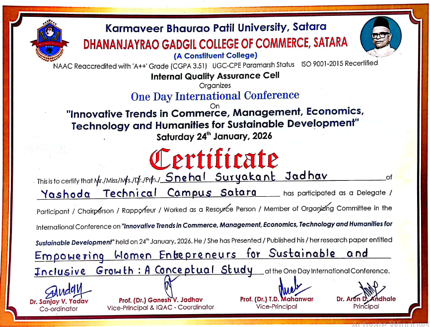 This conceptual research paper explores the mechanisms for empowering women entrepreneurs as a catalyst for sustainable and inclusive economic growth. It analyzes key drivers such as access to finance, skill development, digital enablement, and supportive policy frameworks that strengthen women-led enterprises. The study emphasizes the role of entrepreneurship education and institutional support in enhancing economic participation and leadership among women.This research paper is authored by Ms. Snehal Suryakant Jadhav, at DG College Satara. for the One Day International Conference on Innovative Trends in Commerce Management Economics , Technology and Humanities for Sustainable Development.