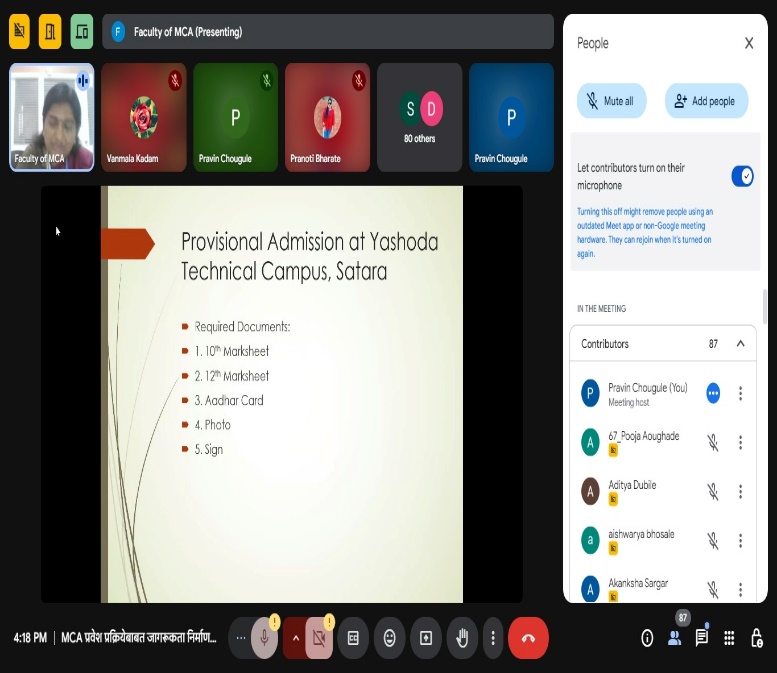 The MCA Department of Yashoda Technical Campus, Satara, successfully conducted an informative online meeting regarding the admission process for the MCA I program on 16/05/2025 and 23/05/2025. The virtual session was aimed at guiding aspiring students and their parents through the admission procedure, eligibility criteria, and academic offerings of the department. On 16/05/2025 there are 85 students was attended the online meeting and 78 students are attending the meeting on 23/05/2025.
